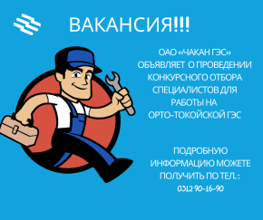 В связи с приближением к завершению строительства Орто-Токойской ГЭС (ориентир город Балыкчы) ОАО «Чакан ГЭС» объявляет конкурсный отбор кандидатов на следующие должности: